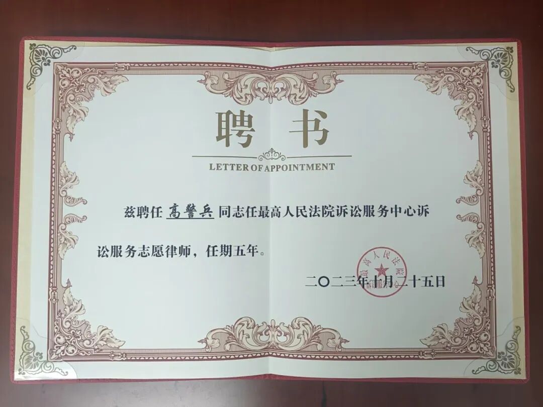 经中国法学会和中华全国律师协会推荐,999彩票律师事务所高警兵、席超、张坤、焦晓丽等多位律师获聘最高人民法院诉讼服务中心志愿律师,任期五年。其中,席超、张坤、焦晓丽律师参加了本次培训并获颁聘书。